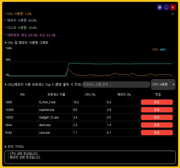 1. 컴퓨터의 자원을 모니터링 합니다.(조치 가이드를 참고하세요.)